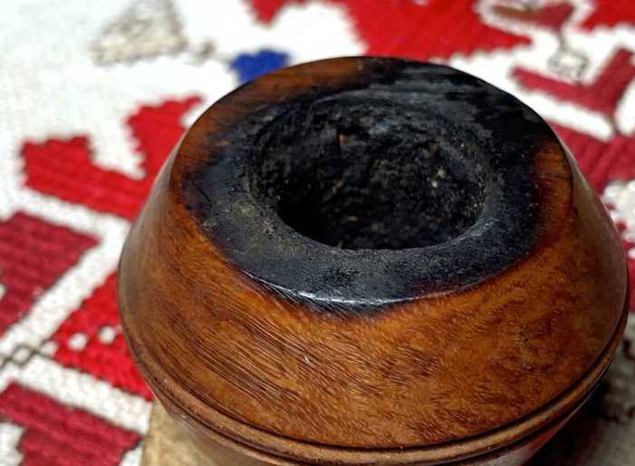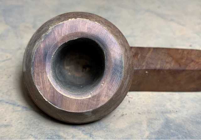 This pictures shows the charring on the dome moving over the rim. This kind of charring will be difficult to remove and not leave a dark stain in the briar.