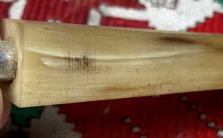 The horn stem is in relatively good condition. There are expected scratches and grime to be addressed. This picture shows well the sinewy material that comprises horn.