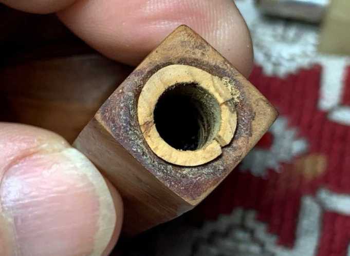 Moving ahead with the internal cleaning, cotton buds, pipe cleaners are used with isopropyl 99% alcohol to clean the internals. A dental spoon is also used to scrape the mortise. Care is given to avoid the cork lining in the mortise, but it is difficult to do with all the activity. This one was really grungy. I find that a lot of oil and tar has collected just beyond the cork liner. The small dental spoon helps to scrape it out, but it is difficult to avoid the cork itself.