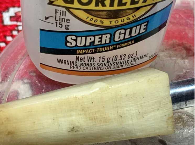 Before proceeding with the sanding of the horn stem, I apply a small drop of regular CA glue to the chip to fill it in. After applying the CA glue, an accelerator is used to keep the patch in place and to quicken the curing process.