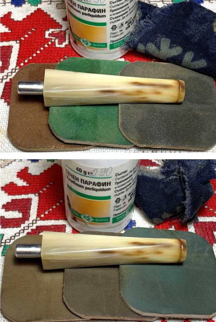 Continuing with the sanding/polishing of the horn stem with micromesh pads, the stem is wet sanded with pads 1500 to 2400. Following this, the stem is dry sanded with pads 3200 to 4000 and 6000 to 12000. Between each set of 3 pads, Paraffin oil is applied to the stem to help condition the horn material. I do not use animal or vegetable oils on pipes in my restorations, but only mineral oils. The reason for this is that animal and vegetable oils can become rancid. Mineral oils are pretty stable. The micromesh process brought out the hues in the horn – not bad.