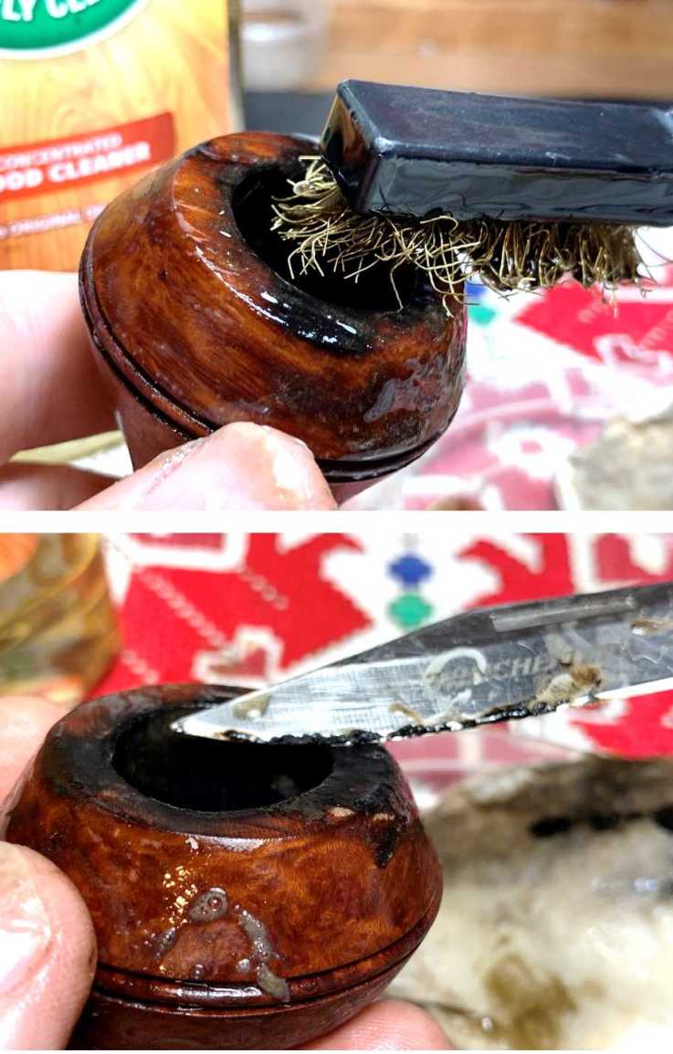 Starting with the stem, pipe cleaners are used with isopropyl 99% to clean the airway. After a few bristled pipe cleaners emerged caked with crud, the pipe cleaners started emerging lighter.