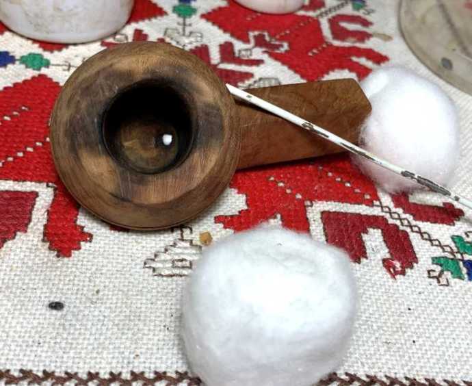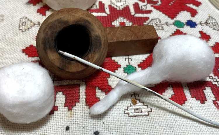 One cotton ball is pulled and stretched to form a ‘wick’ that is guided down the mortise to the draft hole with the help of a stiff wire.