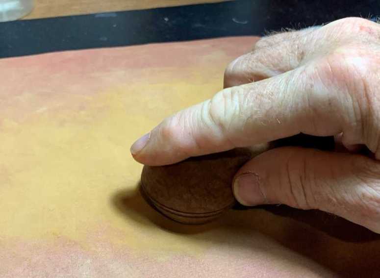 Using a wooden sphere, 220 paper is pinched between the sphere and the inner rim edge and rotated.