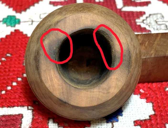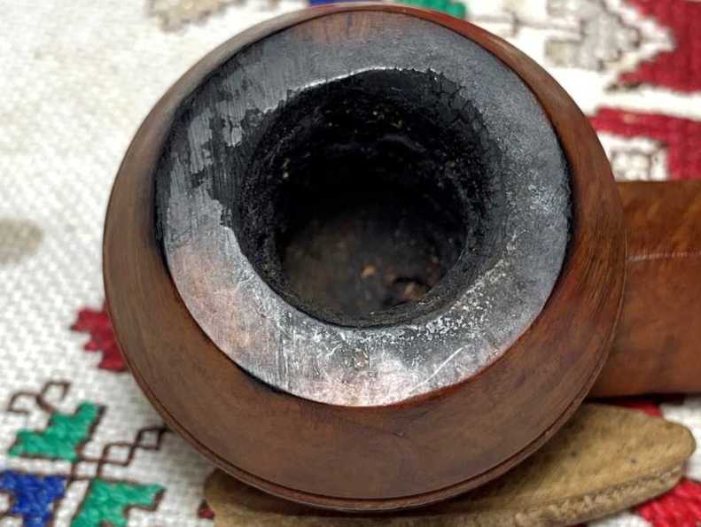 This is what happens when lighting methods pull the flame over the rim! The char has to be removed and cleaned. This will leave a vacant spot on the rim and result in an inner rim edge that is out-of-round which also results in a rim plateau of differing widths. Stewards, lighter OVER the tobacco not over the rim!