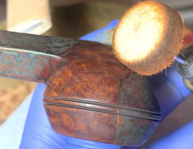 In preparation for application of the wax, the pipe is buffed with a felt cloth to remove the Blue Diamond dust on the briar surface.