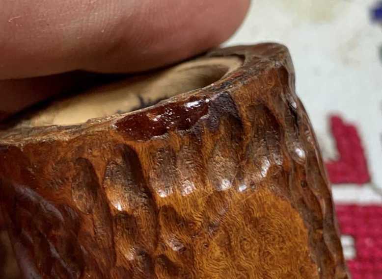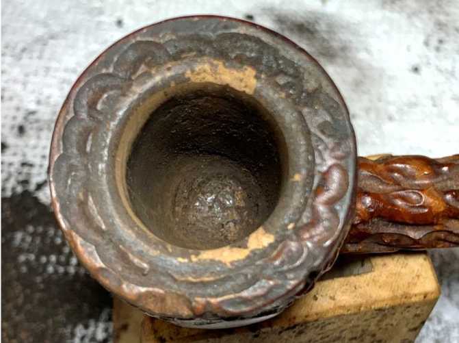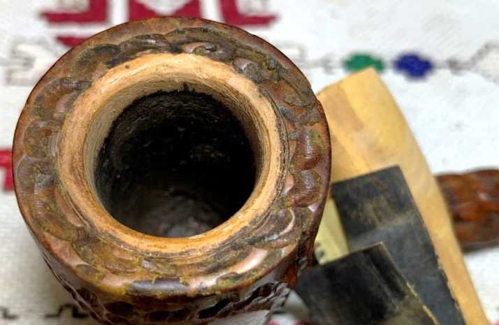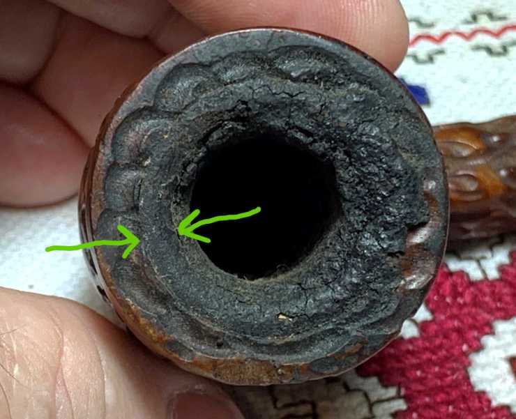 The scalloped rustication is distinctive and the smooth briar panels to me, ‘bake the cake’ along with the classy lines of the gently tapering stem. The grain of the smooth briar ‘finger pad’ panels should pop after cleaning, sanding, and polishing. The chamber has very thick cake build-up which indicates that this pipe was well loved and used, but not maintained in a proper manner. As I’m looking at the chamber observing the thickness of the cake, a thought hits me that this pipe might have a Meerschaum lining. What causes me to question this is the uniformity of the inner ring of ‘cake’. The area between the arrows is what looks like a possible Meer-lining beneath the very thick lava over the rim and cake in the chamber. I had listed this pipe in the Dreamers section for some time as being a rusticated Billiard. A healthy Meerschaum lining will be like frosting on the cake. If this is a Meerschaum lining, the lack of maintenance is still not good. Meerschaum needs no cake at all. The growth of cake on Meerschaum could be detrimental causing the Meerschaum to crack. I’ll clean the chamber gingerly to determine what is beneath the buildup.