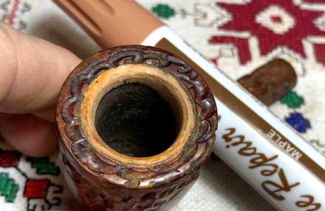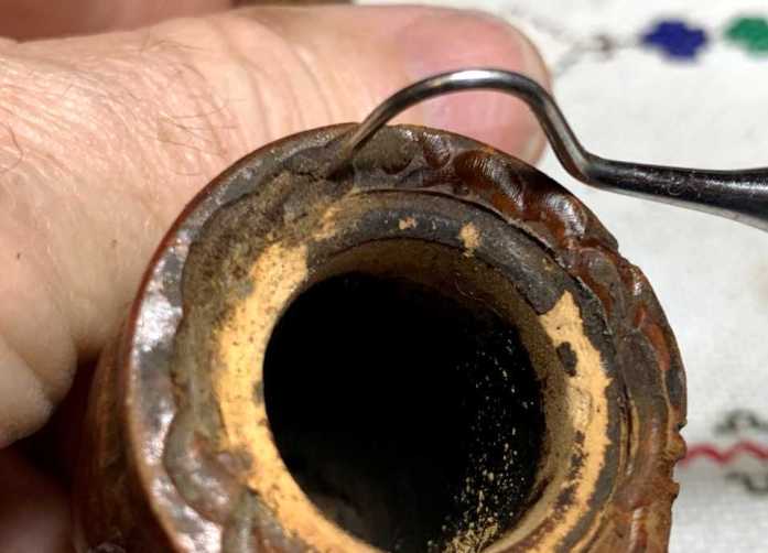 Very lightly, a knife edge is used to scrape the hardened lava caked on the rim. Again, I scrape gently and avoid gouging the Meerschaum with the edge. Along with the knife edge, my thumbnail also helps in the effort.