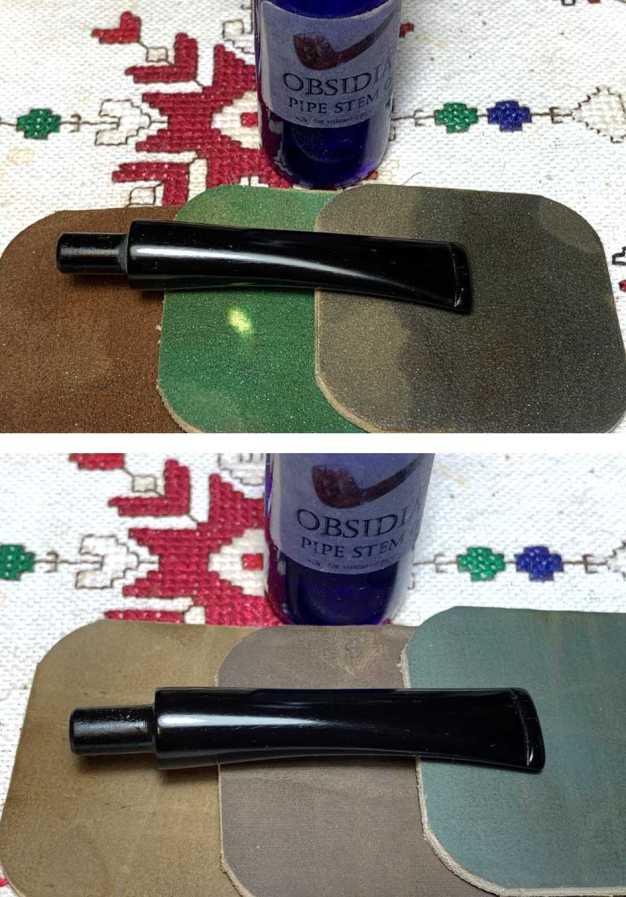 Continuing with the sanding/polishing of the stem, micromesh pads are applied to the stem beginning with wet sanding with pads 1500 to 2400, then dry sanding with pads 3200 to 4000 and 6000 to 12000. Between each set of 3 pads, Obsidian Oil is applied to condition and protect the vulcanite from oxidation. The pop emerges through the process – nice.