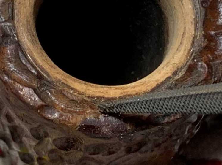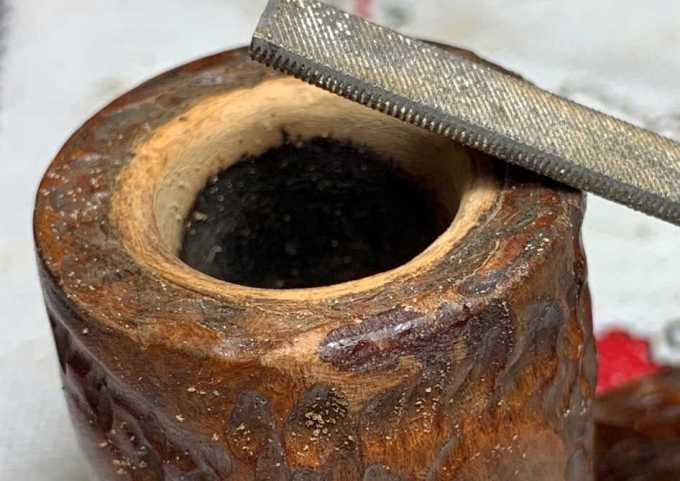 A flat needle file is used to file down the patch material flush with the briar surface.