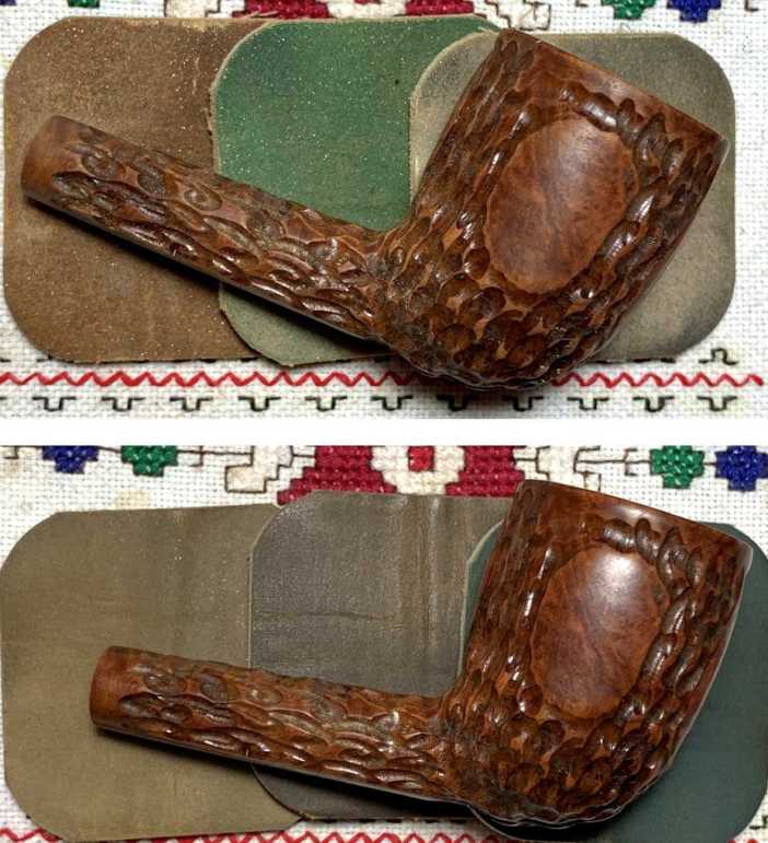Now, on the home stretch. With the stem and stummel reunited, a cotton cloth buffing wheel is mounted on the rotary tool and with the speed set at about 40% full power, Blue Diamond compound, a fine abrasive, is applied to the stem and stummel. For the stummel, the main concentration of the compound buffing was on the 4 smooth briar ‘finger pads’ encircling the bowl, the smooth briar ringing the upper bowl, just below the rim, the smooth panel on the shank underside and the ring of smooth briar ringing the shank facing. A very light application of compound is applied to the large, scalloped rustication. It is kept light so that the compound does not compact in the crevasses – a bear to clean.