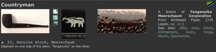 Kiko, meaning “pipe” in Swahili-Kiswahili to English translation, is probably the best known of the various brands listed below. In East Africa Meerschaum is found in Tanganyika, once known as German East Africa, and since 1964 part of the United Republic of Tanzania. The main deposit comes from the Amboseli basin surrounding the Lake Amboseli. Tanganyika Meerschaum is normally stained in shades of brown, black and yellow, and is considered to be inferior to Meerschaum from Turkey. Even though, the raw material is mined by the Tanganyika Meerschaum Corporation and to a large extent used for pipe making. Uncounted pipe makers throughout the world were supplied with Amboseli Meerschaum, preferentially used for Meerschaum lined briars or leather-clad pipes. In Tanganyika the Kilimanjaro Pipe Company Ltd. produced (afak).