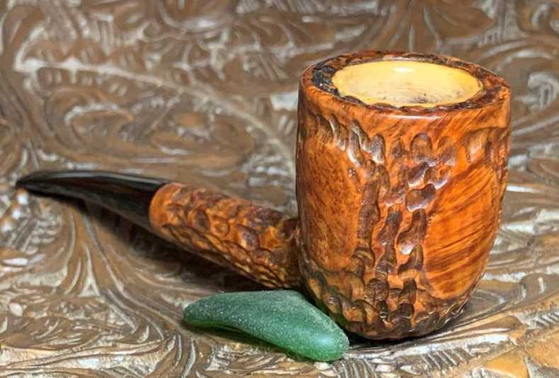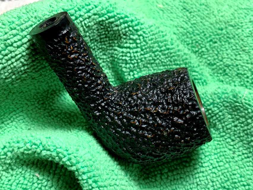 After the stummel fully cools, the beeswax finish is given a hearty hand buffing to remove the excess wax in the nooks and crannies of the rusticated ‘rock’ finish.