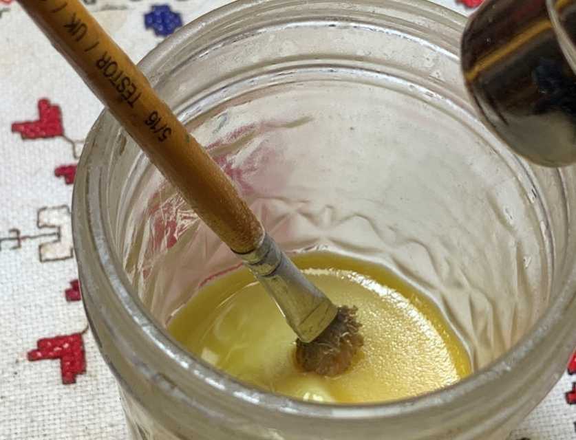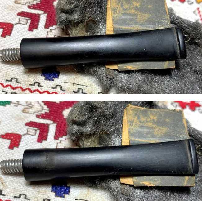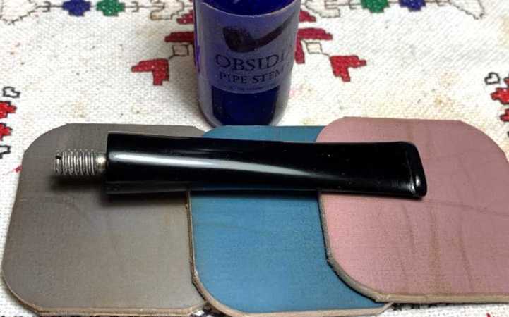 The vulcanite stem next is conditioned with an application of Paraffin Oil. Paraffin Oil is a mineral oil which is preferred over ‘live’ oils of plants or animals which can become rancid. The vulcanite seems to drink it up. The stem is set aside to allow the oil to be absorbed.