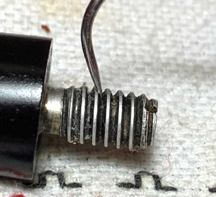Turning now to the stem, the metal threads of the tenon are compacted with gunk. A sharp dental probe is used to dislodge the grime.