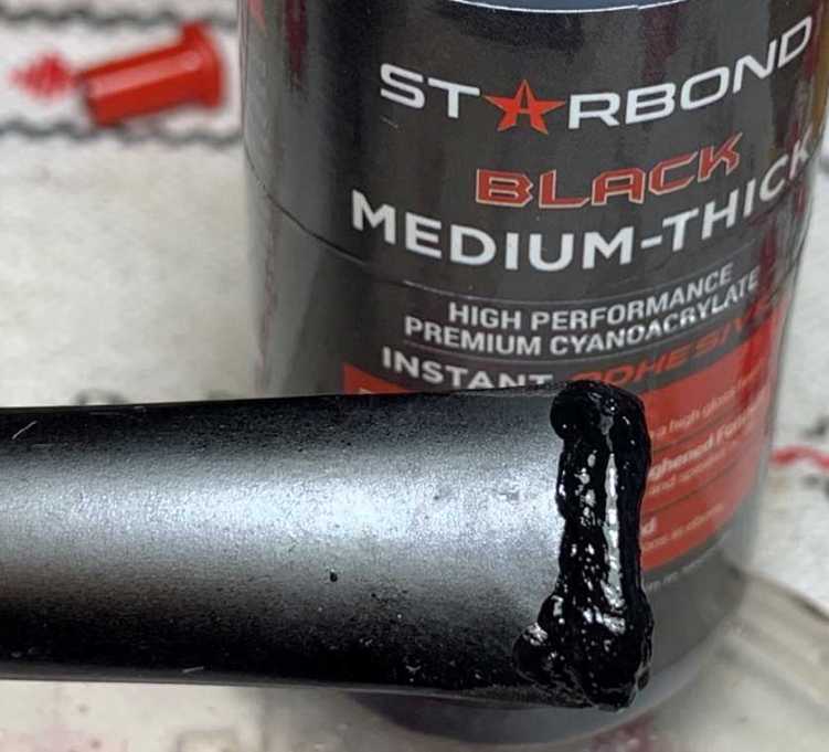 Without improvement from the heating, the button needs to be rebuilt. Rebuilding the button is done by applying Black Medium-Thick CA glue to the button lip and spray accelerator is immediately used which quickly cures the glue and holds it in place. This is done with both the upper and lower button lip to rebuild it. Several layers of CA glue are placed over the lip and between each layering, accelerator was used – both upper and lower.