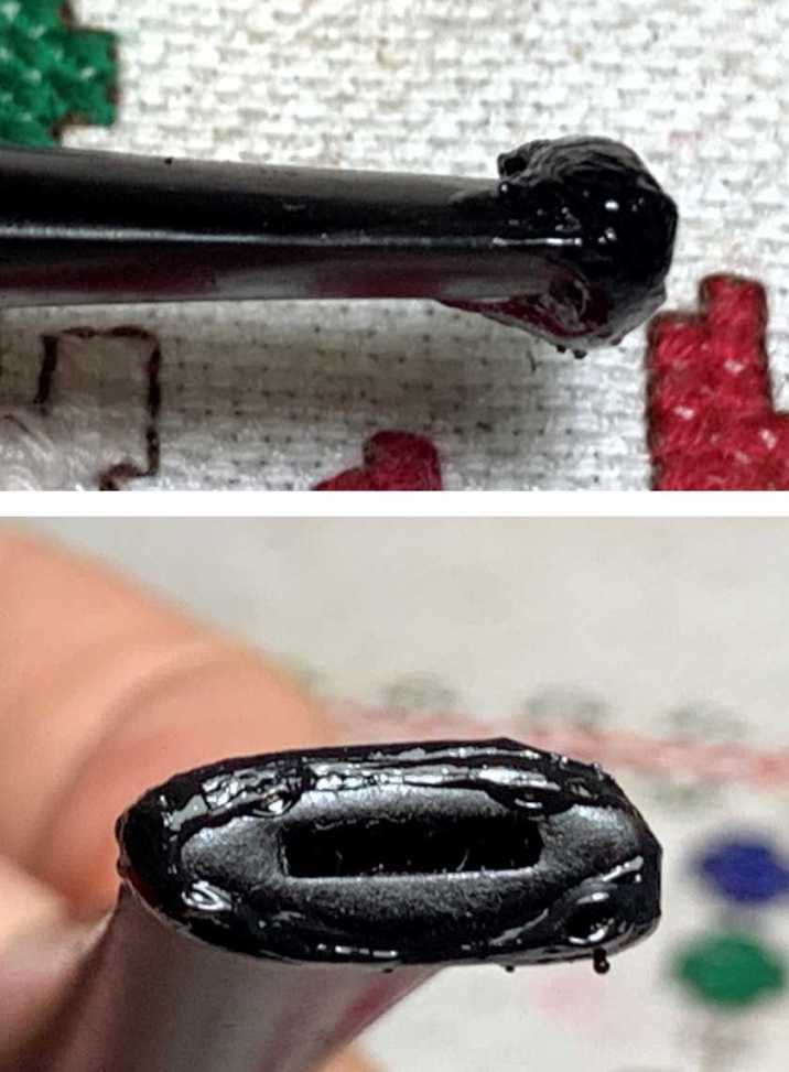 After the stem soaked sufficiently, it is fished out of the soak and with surgical glove clad hands, the thick fluid is squeegeed off the stem and then wiped with a paper towel to begin removing the raised oxidation. From the picture below you can see how dense the raised oxidation is by looking at the soiled paper towel. The paper towel is followed by rubbing the stem’s surface briskly with a cotton cloth to continue removing the oxidation and cleaning the stem. The airway was also cleaned using a pipe cleaner moistened with isopropyl 99%.