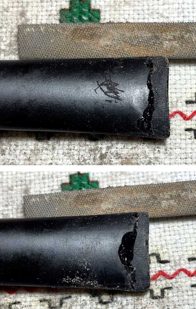 The button, both upper and lower, has been chewed and I am doubtful that the heating method will help much. The upper and lower bit have also been compressed. I’m hopeful that the upper bit will be improved by the heating method, but lower, doubtful. The heating method uses the flame of a Bic lighter to paint the upper and lower bit several times to heat the vulcanite. The rubber compound, when heated, seeks to recover its original position which hopefully minimizes the compressions. The before and after pictures show little improvement to the button. The lower bit will also need to be patched. The upper bit is sanded to see if that will remove the compression. First, the upper bit: