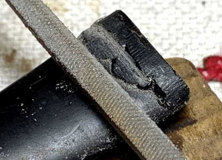 With the boundaries of the button facing established, next the button lip is filed down. I’m not concerned with the stem side of the button lip at this point. I just want to shape the button circumference.