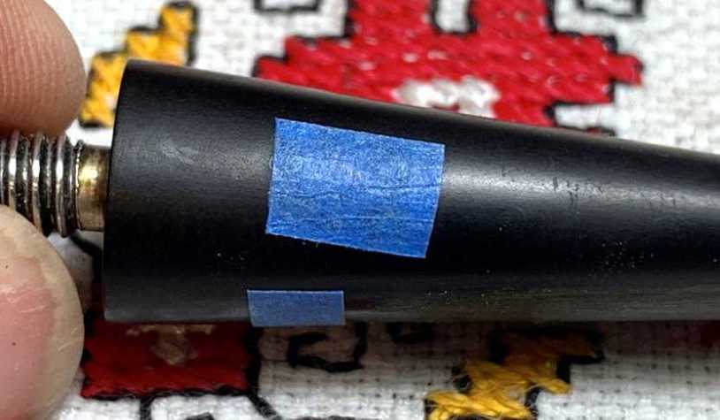 Before the sanding is expanded to the entire stem, the elephant logo and the COM, Tanganyika, are covered with painters’ tape to protect them during the sanding.