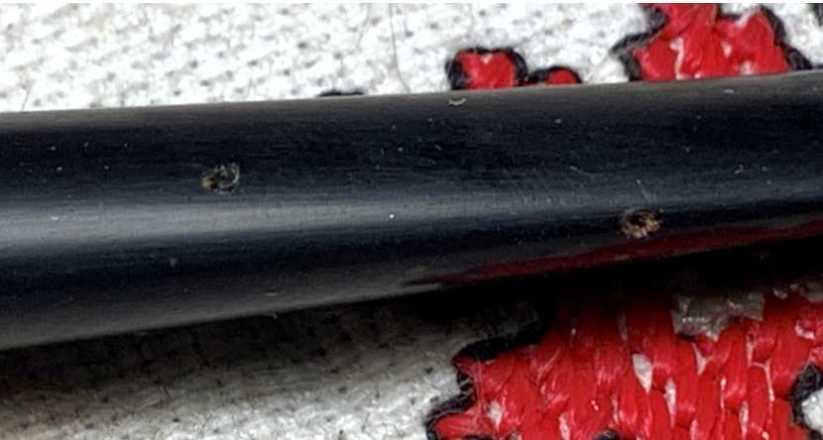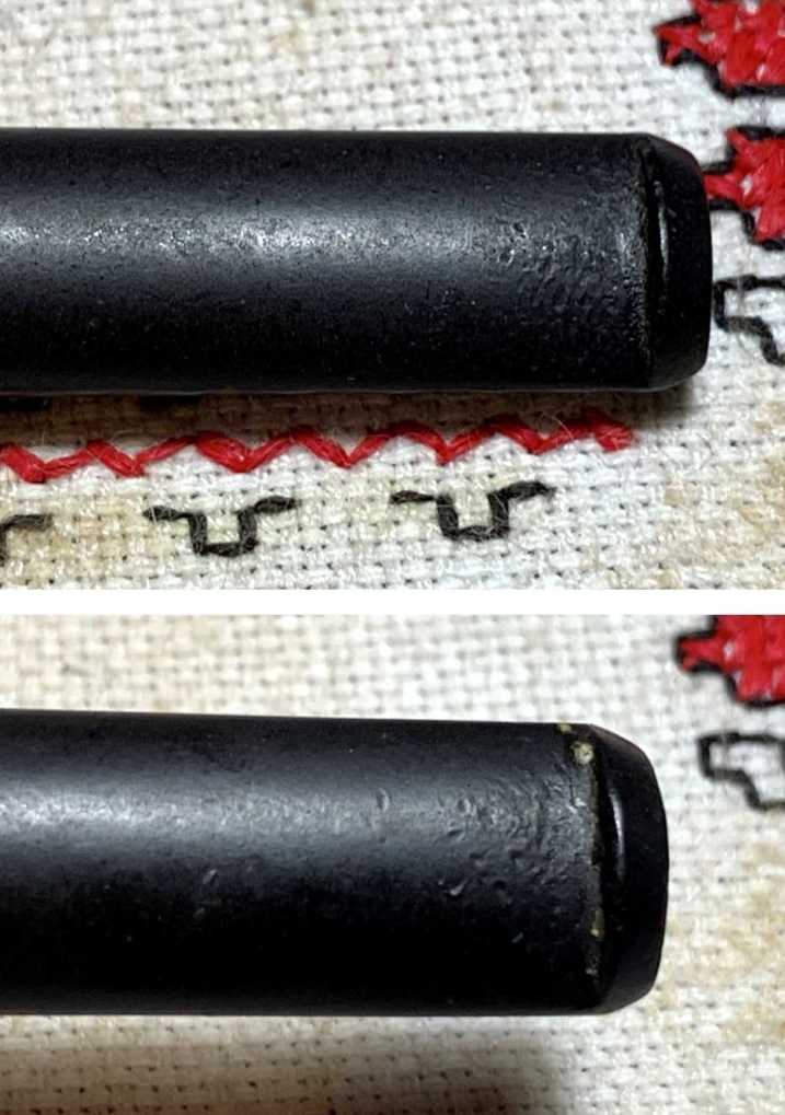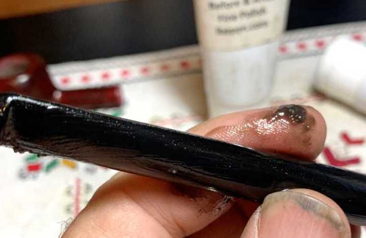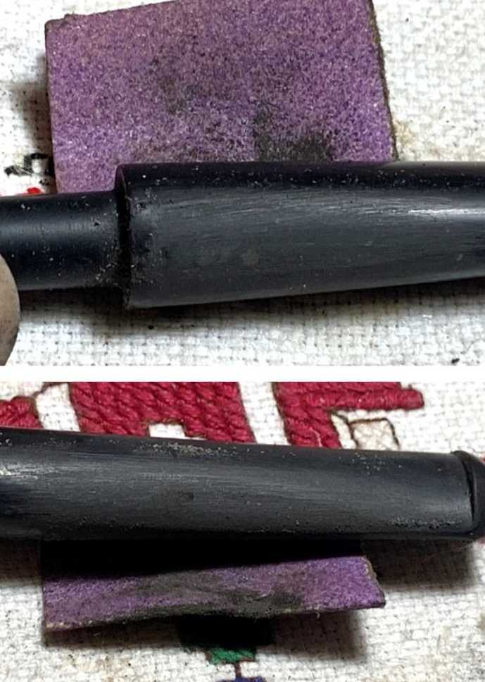 The sanding process came to a halt when after the fine sanding of the steel wool I noticed specks in the stem surface. I didn’t notice these earlier, but in the following picture, 3 blemishes can be seen. The upper and lower are on the surface, but the middle blemish is beneath the surface.