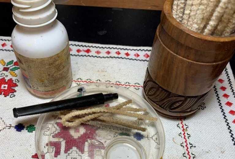 More questions than answers at this point, but with a better understanding of the Hetre name, the restoration begins with the stem. Using pipe cleaners moistened with isopropyl 99% alcohol, the airway is cleaned. It takes only a few pipe cleaners to do the job.