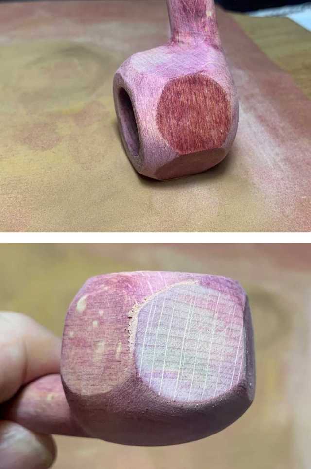 The results are interesting. The wood generally bends toward a reddish hue through the process. There are also white blotches which stand out very distinctly and are not minimized through the sanding. They seem to be aberrations in the grain which change according to how light is reflected on them…. Another interesting thing that I can’t explain is that on the first and third picture above, the view is looking on the two side panels. In both of these, there is a red streak across the panel – like dye streaks. I sanded these panels, and the red streaks would not go away. There is little doubt that an application of dye is the only way to try to give the presentation of this beech wood stummel any sense of continuity. In my reading about beech wood, I discovered that the light wood resists dye, but it can be dyed with a bit of ‘elbow grease’. I’ve been giving it some thought and since the natural bent of the wood is toward a reddish hue, I won’t fight this. As it is now, the color of the wood and/or remnants of dye are several shades of red which is hard to label as one color. If I were pressed to say, it reminds me of cedar wood. My approach will be to apply a dye mixture that is red and black. Black tends to deepen the red color making it more like the color of a red velvet cake – which is not a bad thing 😊.