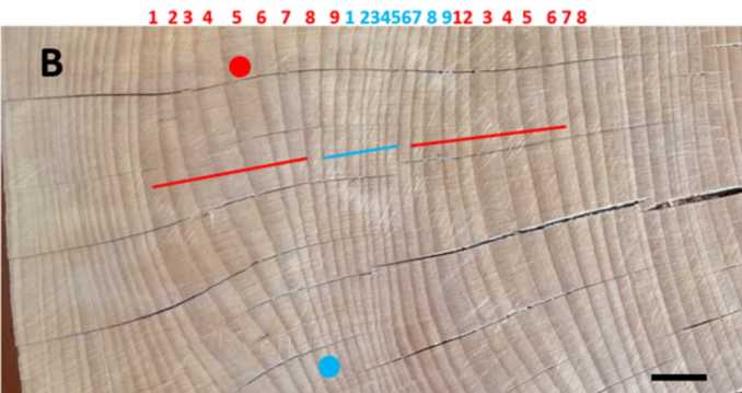 Polished upper surface of a beech wood sample with Z-oriented ripples; (A) sinusoidal outline of the sample edge marks the presence of circumferentially neighboring crests (red dot) and throughs (blue dot). The pattern of the annual rings shows the areas of ring widening and narrowing shifting counterclockwise in time; this means that the ripple pattern migrated downward; (B) magnified view of the ring pattern show sequences of narrower (blue) and wider (red) rings along radial cracks marking the course of wood rays; red and blue dots show how the same annual ring wide in one location becomes narrow in the neighboring area. Scale bars: 10 mm.