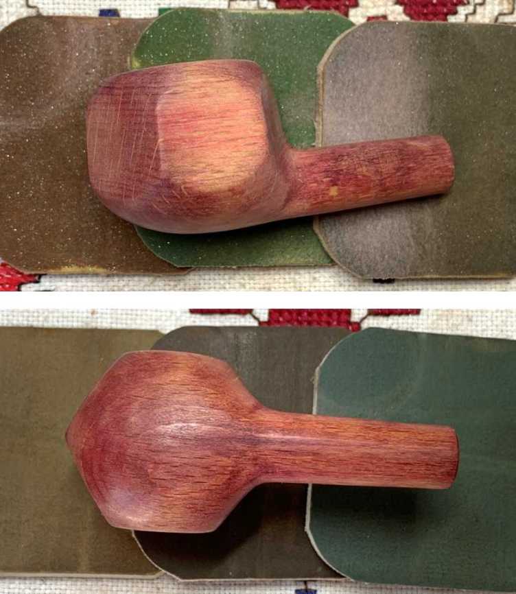 To remove the dye blotches to start as close as possible to a clean slate, 220 paper is used to sand the stummel.