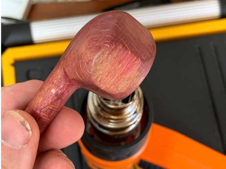 One of the issues of a newly dyed stummel is dye leeching on the hands when the pipe is first put into service. To help to prevent this, the stummel is heated using the hot air gun to emulate the inaugural event.