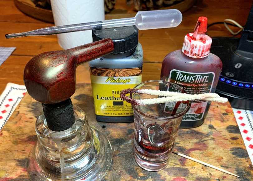 Aiming for the ‘red velvet cake’ red, a small amount of red dye is placed in the shot glass. Flying solely by the seat of my pants, I use a large eye dropper to place 3 drops of Fiebing’s Black Leather Dye into the red and mix. Next, using a folded pipe cleaner, the dye mixture is painted onto the stummel. I only do a ‘dye wash’ because I have learned that when I mix an aniline dye (alcohol based) with the inert red tint, there’s not enough alcohol to combust using the flaming method. To make sure the application of dye mixture is thorough, it is applied a second time to the stummel.