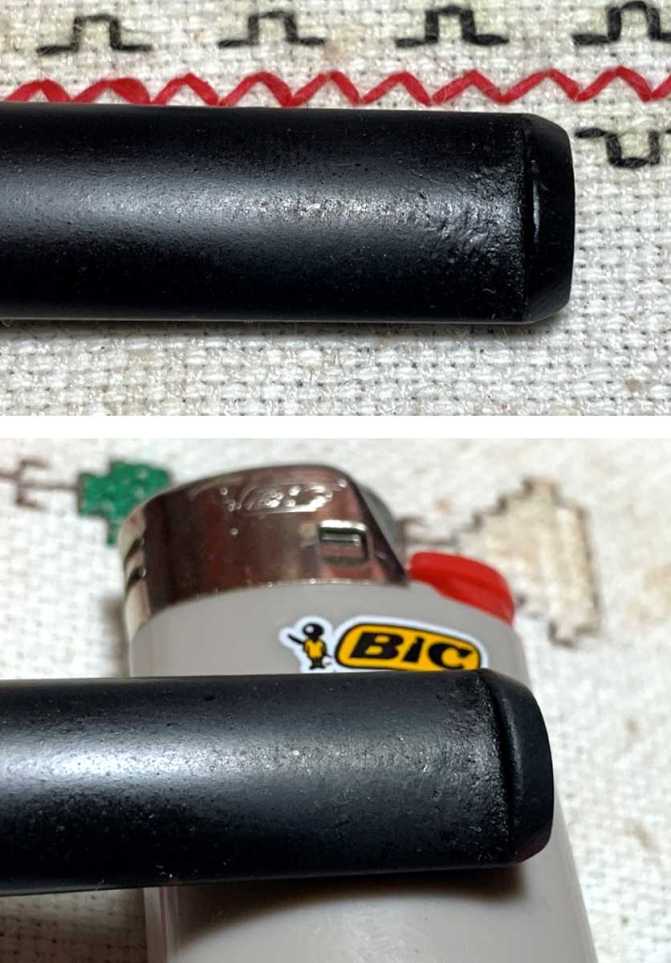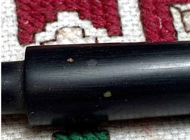 I found two other blemishes on the side of the stem toward the button. There were other blemishes as well, but they were not as ‘eye catching’ as these. Sanding would not erase these specks. I have never seen something like this before – colored specks in the rubber compound.