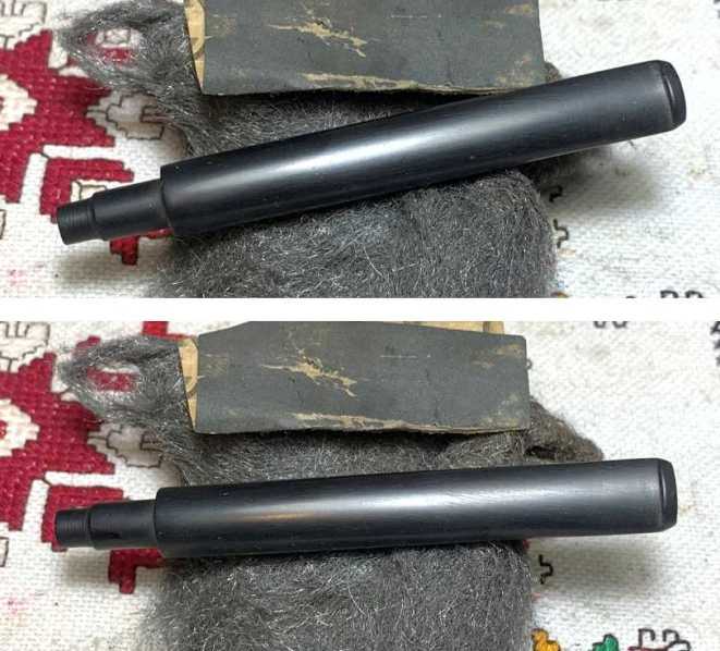 After the time has elapsed, the stem is fished out of the ‘Before & After’ soak and allowed a few minutes to drain. The fluid is initially wiped off with paper towel then the surface is rubbed briskly with a cotton cloth to wipe off the raised oxidation. The negligible oxidation seems to have been addressed by Mark’s Deoxidizer very nicely.