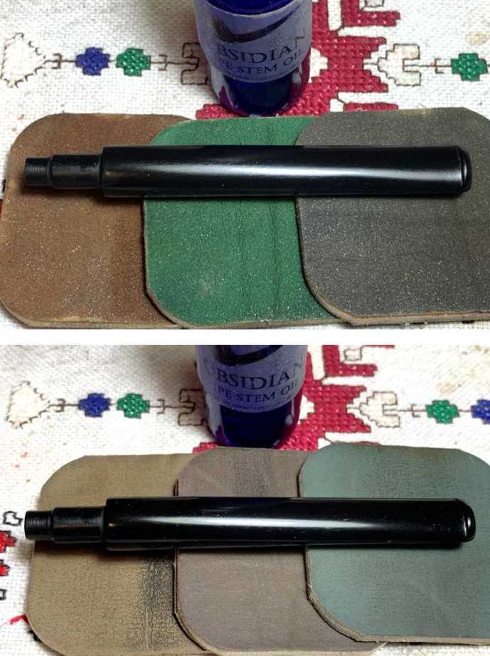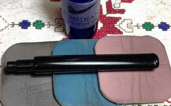 Next, micromesh pads are used to sand/polish the stem further starting by wet sanding with pads 1500 to 2400. This is followed by dry sanding with pads 3200 to 4000 and 6000 to 12000. After each set of 3 pads, Obsidian Oil is applied to the stem to further condition the vulcanite and to guard against oxidation.