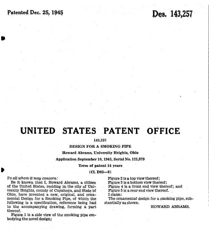One more question remains in my mind regarding the Pat. Pend. designation in the nomenclature. If this patent was pending, is there a way to determine when the ‘pending’ expired and the pipes became simply, ‘Patent’? To explore this further a simple search at https://ppubs.uspto.gov/ came up with copies of the original patent application by Howard Abrams. Looking at these documents are fascinating to me, especially the diagrams. Mr. Abrams calls his design as an ‘ornamental design for a smoking pipe’.