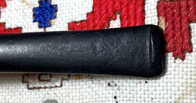The teeth chatter on the bit is significant. To address this initially, the heating method is used by painting each side of the button with the flame of a Bic lighter. As the vulcanite heats the physics of the rubber go into action and the rubber expands to some degree recovering its original condition. The before and after pictures show not much improvement after the heating. First is the upper bit: