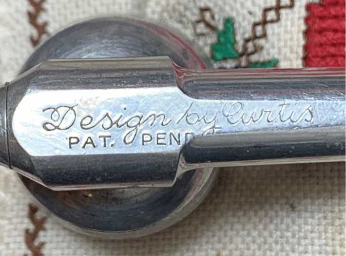 The nomenclature is stamped on the undercarriage of the barrel. Stamped in fancy cursive is ‘Design by Curtis’ [over] PAT. PEND.