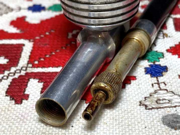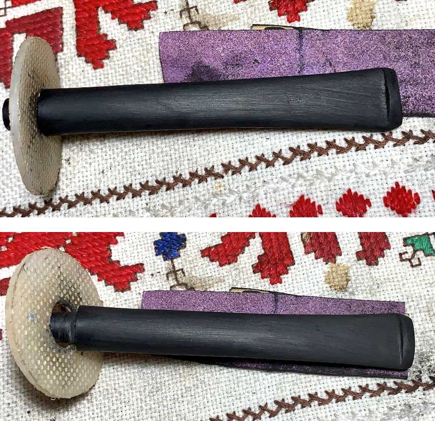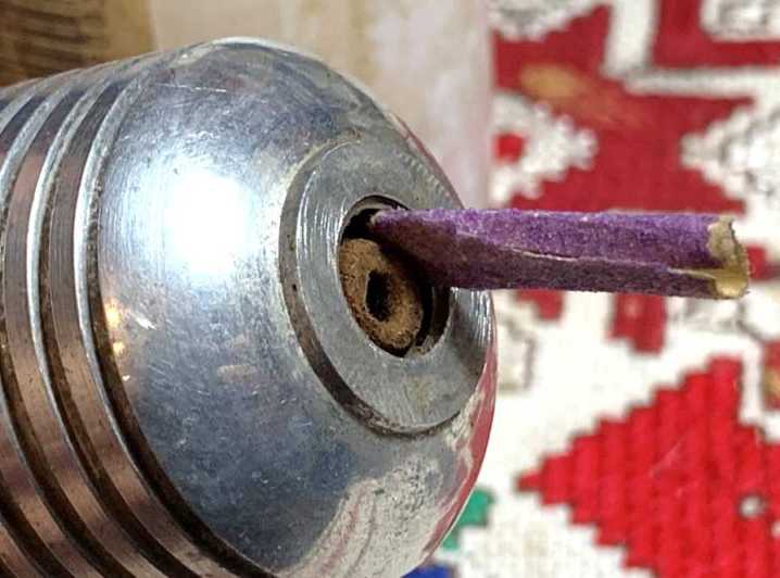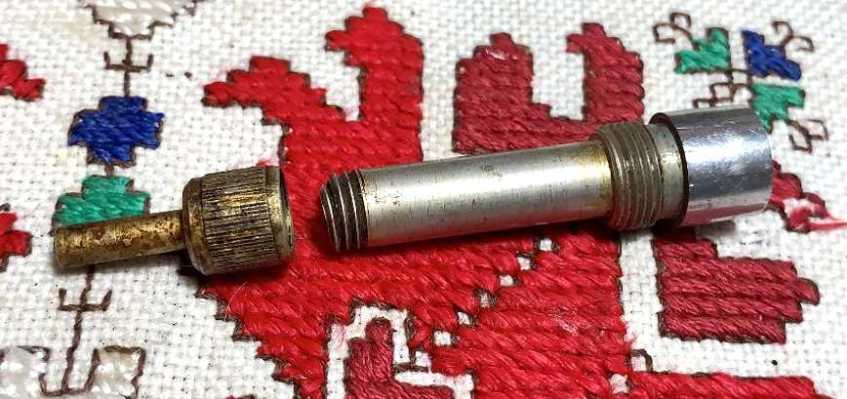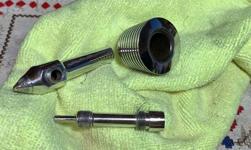 I’m thankful for folks like Steve and Doug who have been doing restorations longer than I and have a wealth of knowledge to share. Doug’s specialty in working with metal pipes comes after years as a professional metal polisher. Doug’s advice to remove the stem was to pop it out by placing a metal dowel through the metal fittings and tapping it with a hammer. As my metal dowel, I utilized a 3/16 inches stainless tubing. After securing the metal fittings in the bench vise protected by a piece of leather, a hammer gently tapped on the end of the tubing.