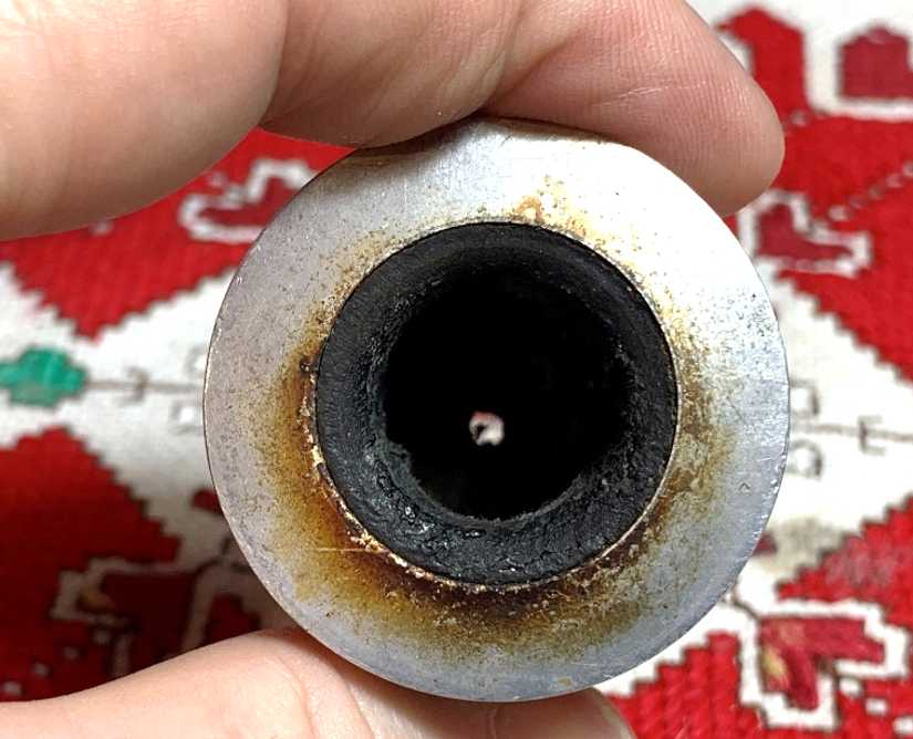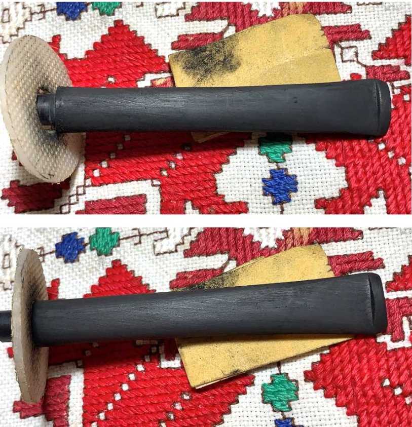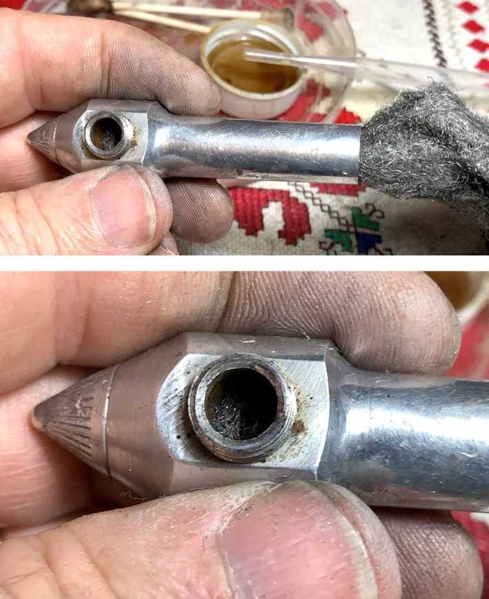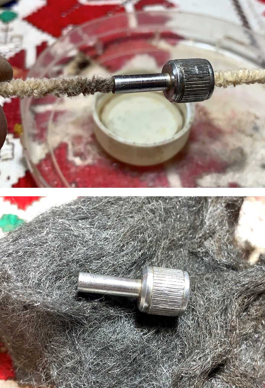 Next, the cleaning process is focused on the barrel that traps all the moisture. It becomes a bit more difficult to clean since the nose cone would not budge. I first use cotton buds moistened with isopropyl 99% to reach into the barrel. To add some muscle to the cleaning, 0000 grade steel wool is also used by twisting it tight enough to fit and force down the barrel to the end with the help of a stiff wire. Alcohol is then placed in the bowl junction hole and absorbed into the steel wool. Next, the steel wool is rotated to create the abrasion to clean the inner barrel.
