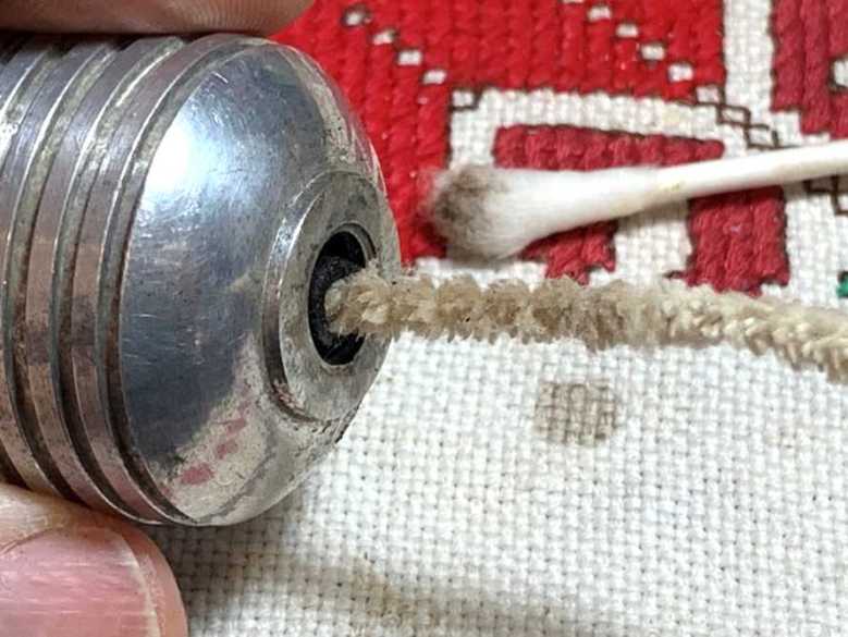 After the steel wool is retracted, the cleaning continues with cotton buds to confirm that the barrel is clean.