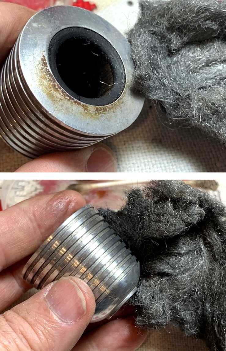 Next, the external surface of the barrel is cleaned and shined with 0000 steel wool – before and after pictures follow.