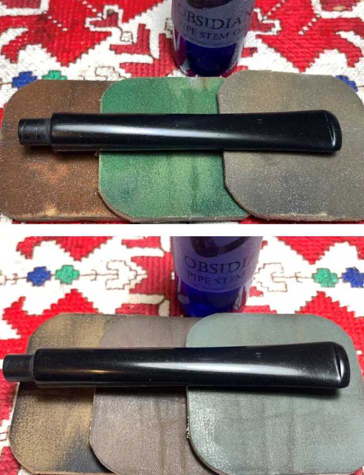 Next, sanding/polishing with the regimen of micromesh pads starts by wet sanding with pads 1500 to 2400. This is followed by dry sanding with pads 3200 to 4000 and 6000 to 12000. Between each set of 3 pads Obsidian Oil is applied to condition the rubber stem and to guard against future oxidation. The pop of the rubber resulting from the process is fun to see emerge.