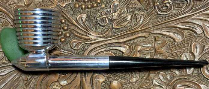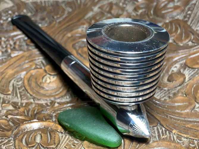 This smoking metal pipe is really Art Deco looking. It has a metal finned bowl with a pressure fit top cap holding in a briar bowl. There is a threaded connector between the bowl and the metal shank base. The connector threads into both the bowl and the shank. The shank has a pointed end cap that is frozen in place. The bowl was caked and worn. The stem had bite marks on both the top and the bottom sides near the button. The stem is a military mount that sits in a stepped down interior of the metal shank. There is a tube at the end of the airway in the shank that seems to have holes in it as the air flows through when blown into the end. The exterior of the pipe is oxidized and dull. The bottom of the shank is stamped Design by Curtis over Pat. Pend. It is a brand about which I know nothing.