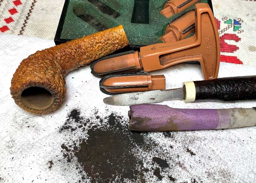 The chamber is first reamed with the Pipnet Reaming Kit. This is followed by scraping the chamber with the Savinelli Fitsall Tool. To remove the final carbon cake buildup, the chamber walls are sanded with 220 grade paper wrapped around a Sharpie Pen for leverage.