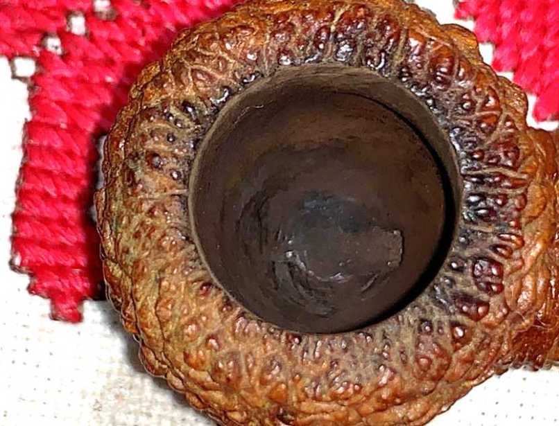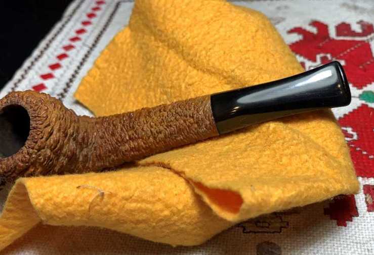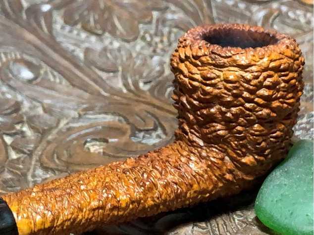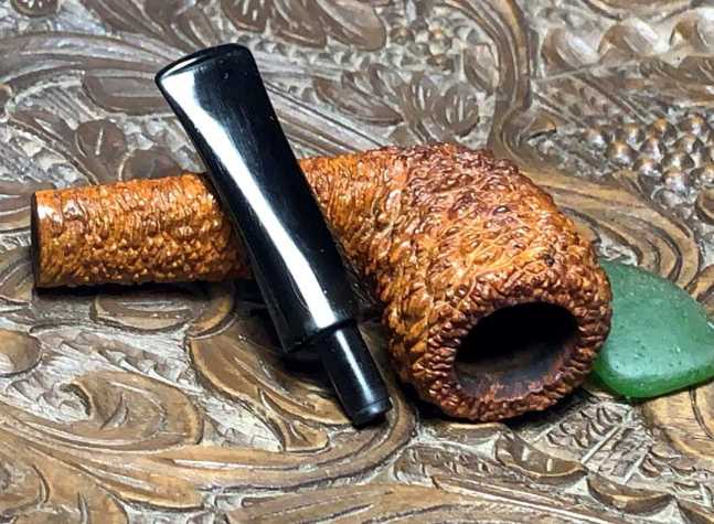 The uniquely rusticated briar is eye catching, but the briar seems a bit dry to me. To give the briar some life and to condition the briar, a very light wiping of Paraffin oil is applied. The briar loves this TLC and seems to drink it up. The light, blonde briar hue has transformed into a rich butterscotch with the mineral oil application. As a general practice, ‘live’ animal or plant oils are not used on pipes. I met a Greek wood artisan some years back on a trip from Sofia, Bulgaria, to the costal city of Parga, Greece. The beauty of this artisan’s work and the processes used on the ancient olive wood he shaped, have stayed with me. With the purchase of one of his pieces, I asked for his advice in keeping the wood alive and vibrant. His advice was to use mineral oils and not live oils because lives oils can turn rancid. Paraffin oil has been my oil of choice for several years.