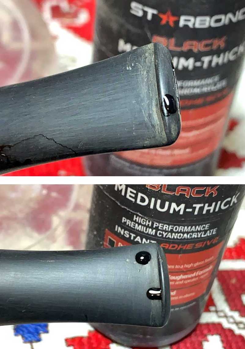 After cleaning the area with alcohol, Medium-Thick Black CA glue is used to fill the compressions and the stem is set aside to allow the patches to cure.