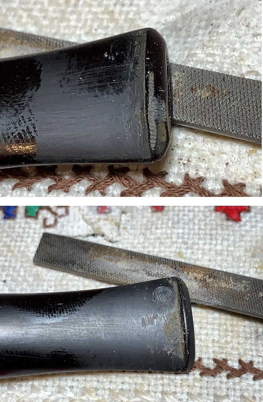 After filing the patches flush with the stem surface, the entire stem is sanded with 220 grade paper using a plastic disk as a shoulder guard for the stem facing.