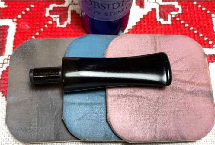 The stem is looking good. The next step in sanding/polishing is applying micromesh pads to the stem by starting with wet sanding with pads 1500, 1800 and 2400. This is followed by dry sanding with pads 3200, 3600, 4000, then pads 6000, 8000, and 12000. To prevent future oxidation and to condition the vulcanite stem, Obsidian Oil is applied after each set of 3 pads. I love to watch the glassy sheen emerge during the micromesh process.