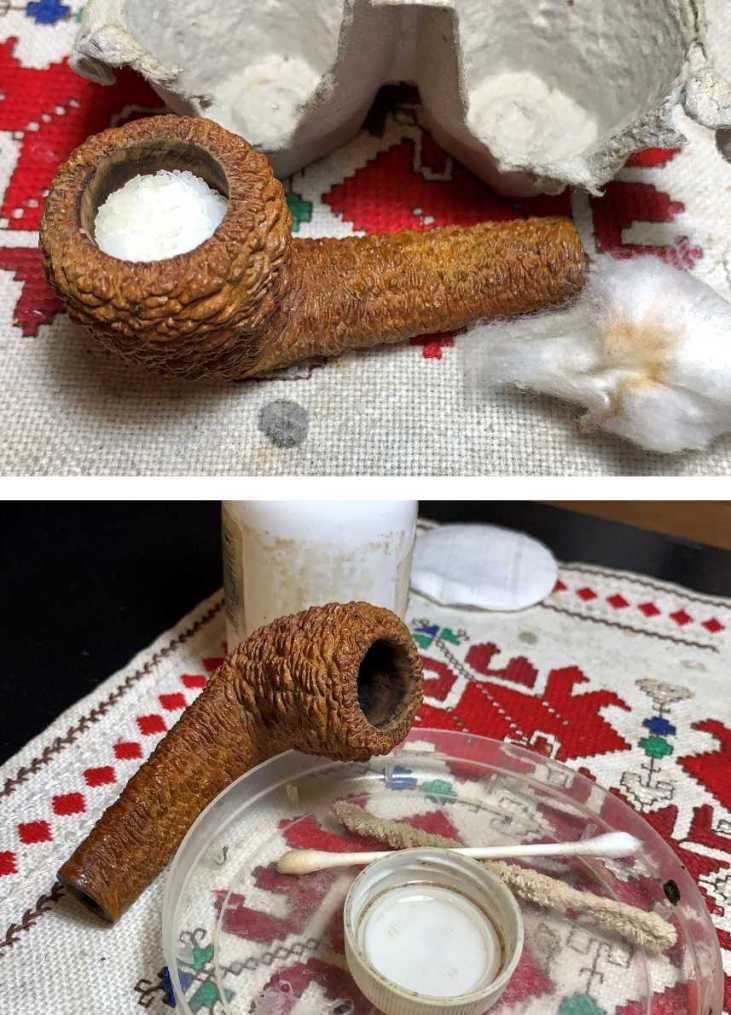 The stummel has soaked through the night in an alcohol and kosher salt process that helps to clean the internal briar further. Usually, the cotton wick pulls out in one piece. Unfortunately, this time, it tore in two and a dental probe was necessary to dig out the severed part. The salt is slightly soiled, and the cotton shows a bit. After the expended salt is tossed and the bowl is wiped, one pipe cleaner and cotton bud confirm the internals are as clean as they will get.