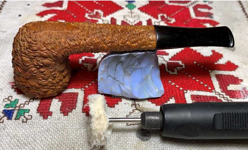 The next step is to apply the fine abrasive compound, Blue Diamond to the stem alone and only to the nomenclature smooth briar panel on the heel. The sea rock finish will gum up if compound is applied to the rough surface. A cotton cloth buffing wheel is mounted on the rotary tool with the speed set at about 40%, the compound is then applied.